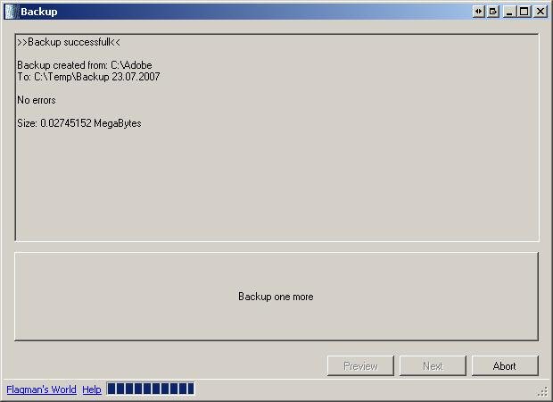 With this application you can create fast and easy a Backup of a Folder. For more Information it has a HTML-Help.The last configuration will be saved in a XML-File. The results of the progress will be stored in a protocol-file.