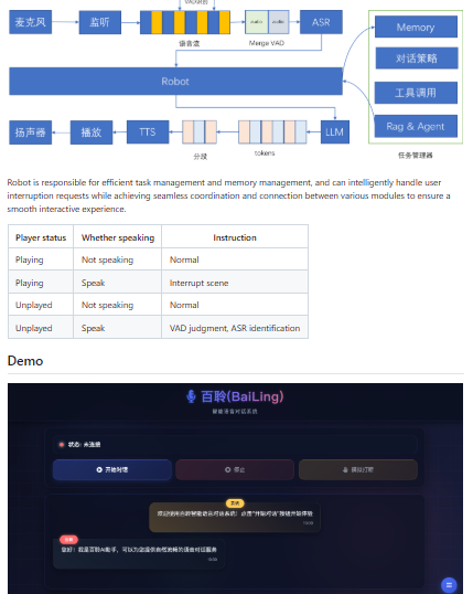 - Full voice-dialogue stack combining ASR, VAD, LLM, and TTS for natural spoken conversation
