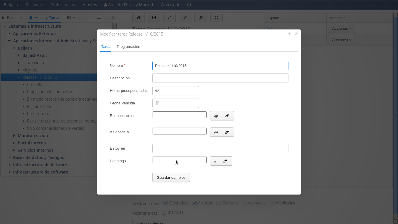 Baljash es mi organizador de trabajo. Defino las áreas y subáreas y entro de ellas las tareas y subtareas que deben realizarse. Hay tareas o areas que oslo contienen ficheros asociados, pero hay otras que describen lo que se ha de hacer,del timepo presupuestado, antes de cuado hay que entregarlo, si no nay que empezarlo hasra una fecha determinada, si se repite periódicamente, quienes será los ejecutores. Avisa fechas de vencimiento, Activa tareas aparcadas. Búsquedas. Oculta la información irrelevante. Permite tener colaboladores externos distintos en cada una de las partes de la estrucura. Todas las acciones van selladas en tiempo y por el usuario que la realizó y son inalterables. Cuando manejo 500 tareas es difícil tener todos los detalles. Al registrarlos e Baljash, todo queda organizado y centralizado