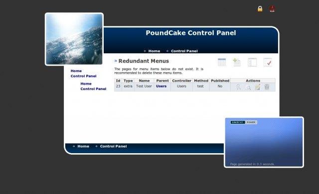 PoundCake Control Panel (CakePHP plugin) - admin panel for users and groups management, dynamic database driven ACL menus generation and management, permissions assignment to users and groups.