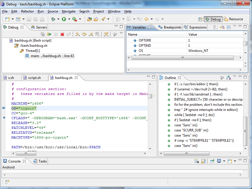Debugger for Bash version 3(Bourne again shell). Plugin for Eclipse. Will only work with shell script editor ShellEd.