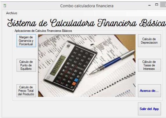 Calculadora Financiera Básica, una forma de calcular sencilla y de forma precisa para sus cálculos básicos financieros como: Cálculo de Márgenes de Ganancia y la Porcentual (muy utilizadas para la gente común y comerciantes), la depreciación, cálculo del Punto de Equilibrio, cálculo de Tasas de Intereses y Amortizaciones básicas, cálculo del precio total (¡Incluye Estilo factura en Pantalla!)