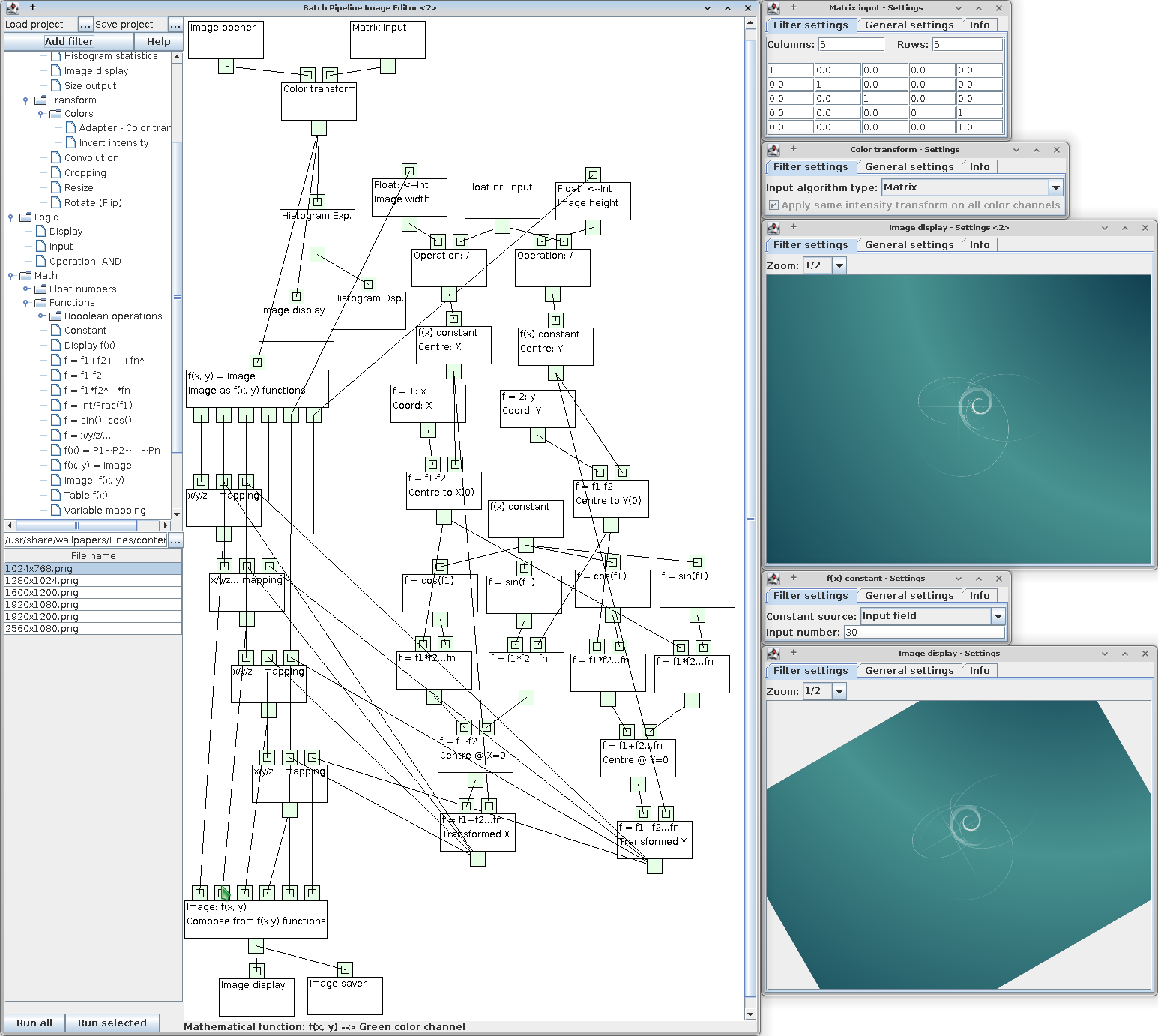 - Dynamic mathematical functions for custom and automated image filtering: General mathematical operations, using image or matrix as f(x, y), export f(x, y) as image or matrix, mapping variables on other ones and of course boolean operation for case sensitivity