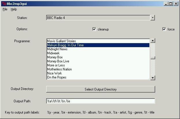 bbc2mp3 is a simple tool for saving BBC ``Listen Again'' programmes as MP3 files. It can be run either as a command line programme or a simple GUI. It works by saving an audio stream as a wav file (using mplayer) and converting this to mp3 (using lame)