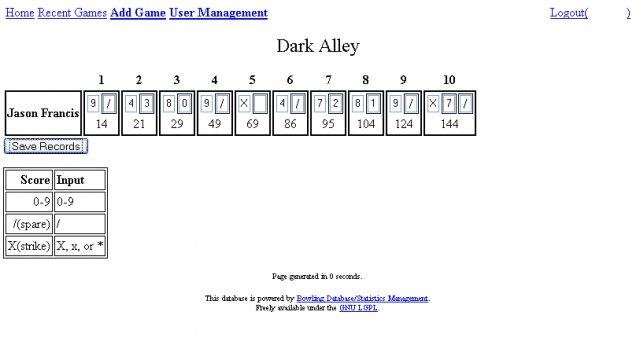 A tenpin bowling database which is able to track the statistics of many users with a wide range of granularity. From averages and game scores to detailed pin-fall for each frame.