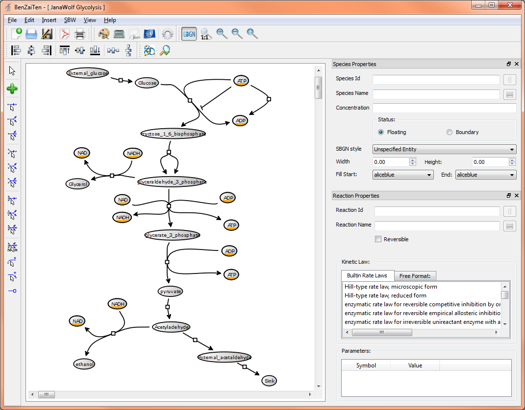 Ben(Zai)Ten is a graphical modeling environment for computational and systems biology. It supports the community exchange standards: SBML, SBRML, SED-ML as well as ontologies: MIRIAM, SBO, ChEBI, KEGG, GO