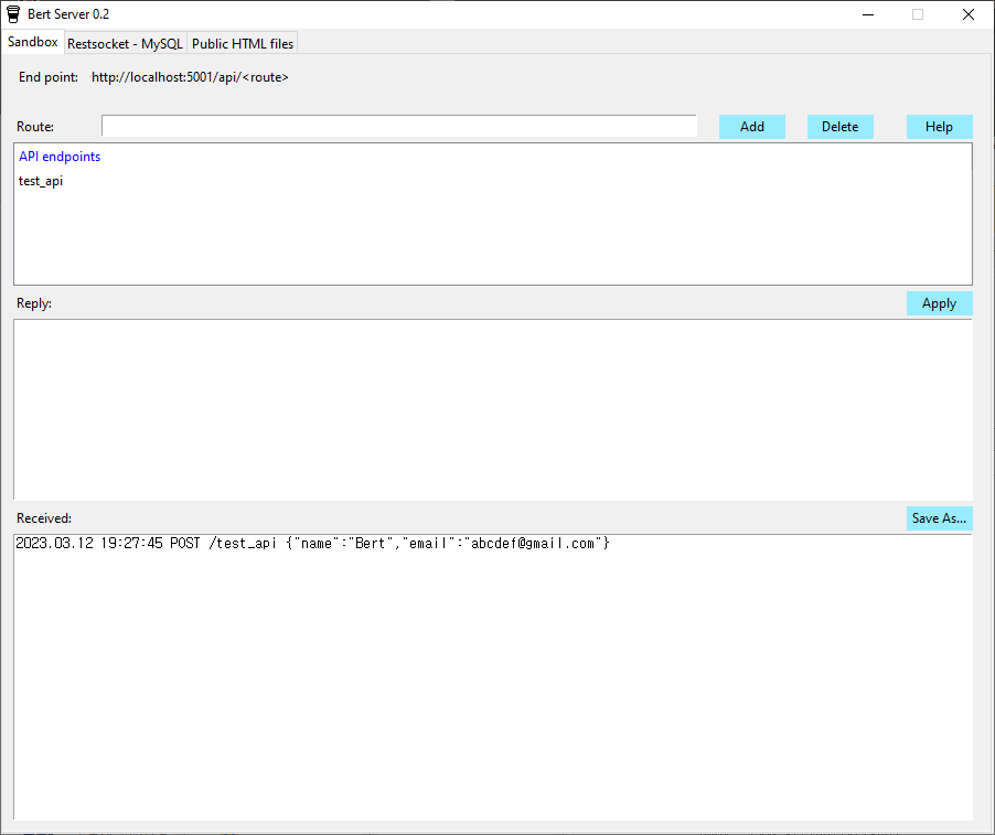 Upon launching Bert Server (as a Windows desktop application), a local REST API server becomes available at http://localhost:5001. Users can make any REST API request (POST or GET) to any desired route. Bert Server records logs of all requests made and allows for defining custom responses for specific routes. Bert Server includes a small HTTP server serves static html files and automatic generated REST API server from your MySQL database. Just after setting up MySQL connection string, you can use it as a REST API server providing CURD APIs of your MySQL database.