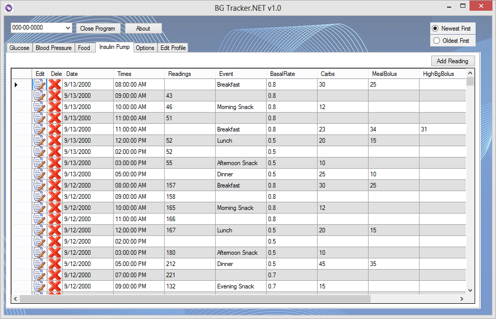 The program is based upon an original creation by Jim Berry under the program name of Bg Tracker. The code base was Delphi visual basic with FoxPro as the database back end. This new version uses .NET Framework version 4.5 with SQL Server Compact Edition for a very light program footprint.