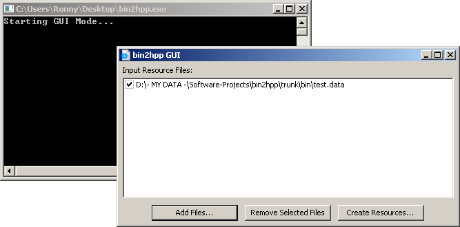 Binary data files will be converted to HEX representation and stored in a 'resource.h' and 'resource.cpp' file