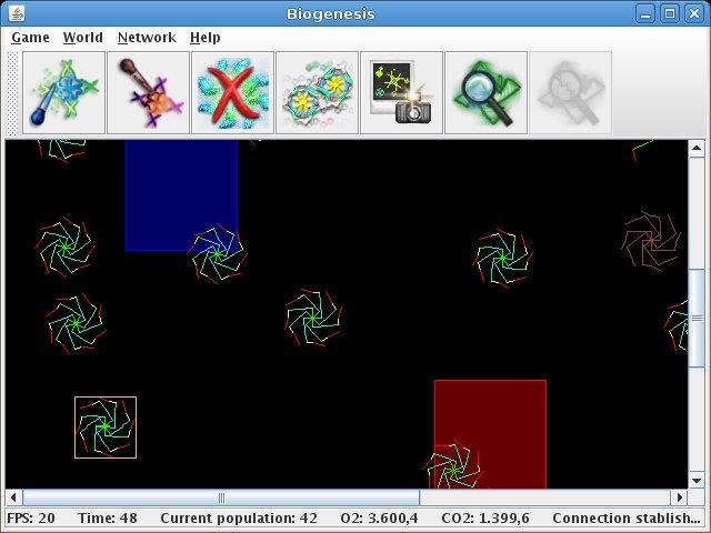 Biogenesis is an artificial life program that simulates the processes involved in the evolution of organisms. It shows colored segment based organisms that mutate and evolve in a 2D environment. Biogenesis is based on Primordial Life.