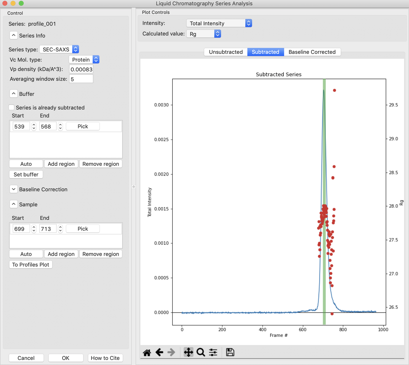 - Calculate radius of gyration (Rg) and I(0) via Guinier fit