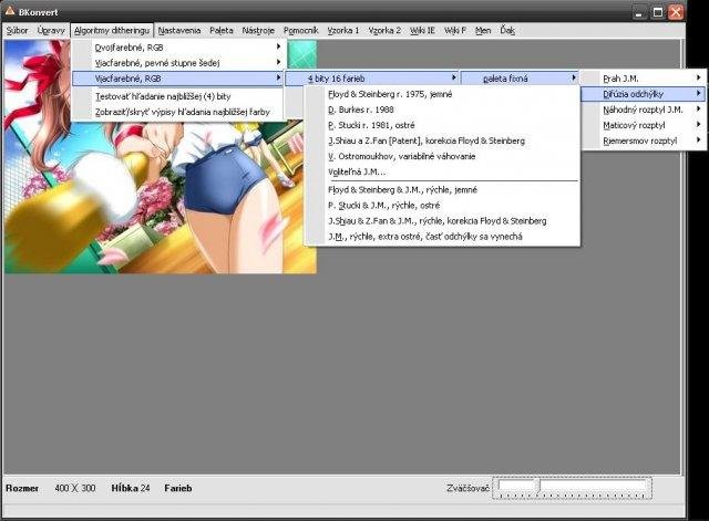 Program to dither images and to decrease their graphical depth while preserving the appearance of the original as strong as possible. Written in C++, uses VCL from BCB 5.0. It implements algorithms such as Error Diffusion, Riemersma, Ordered dither..