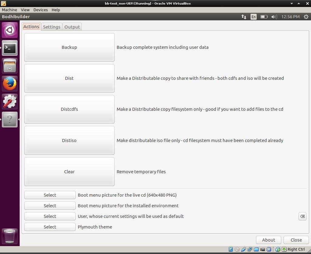 Bodhibuilder is a fork of the old Remastersys script, it has been tuned to create a bootable live ISO of your Bodhi Linux OS or Ubuntu based derivatives. There are 2 types of modes available: backup mode and distribution mode.