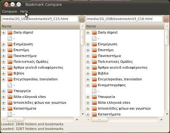 Lists and compares two html bookmark files (as defined by firefox) side by side and notes the similarities and the differences in a colored list through the GUI environment.