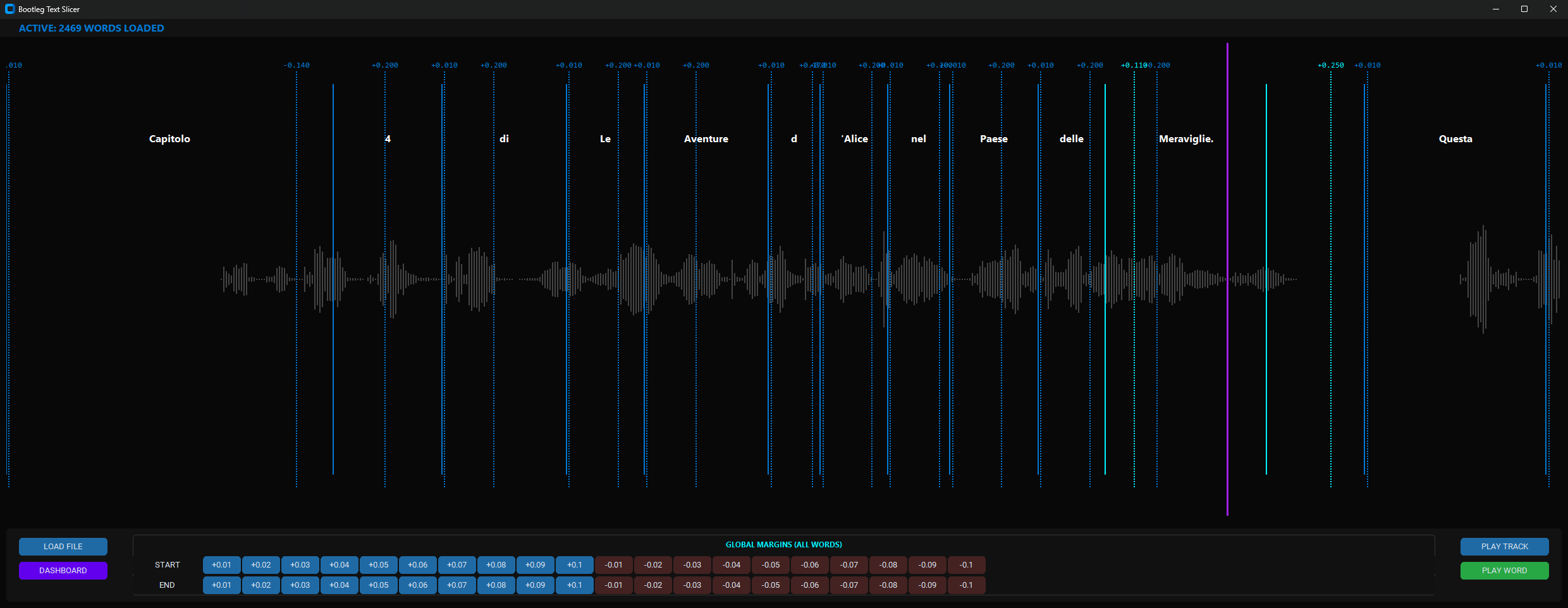 - Adjust timing offsets for the beginning and end of each word either globally or individually.