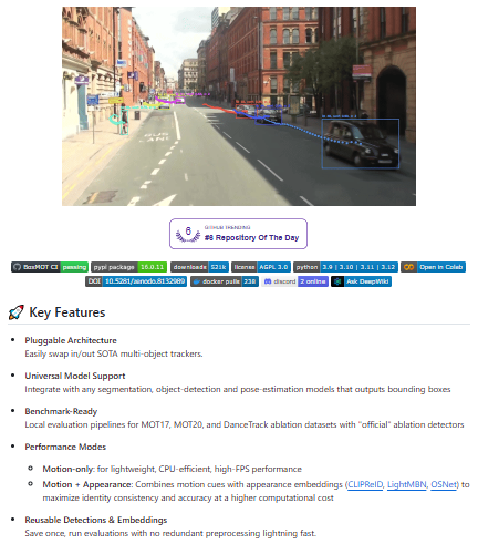 BoxMOT is an open-source framework designed to provide modular implementations of state-of-the-art multi-object tracking algorithms for computer vision applications. The project focuses on the tracking-by-detection paradigm, where objects detected by vision models are continuously tracked across frames in a video sequence. It provides a pluggable architecture that allows developers to combine different object detectors with multiple tracking algorithms without modifying the core codebase. The framework supports integration with detection, segmentation, and pose estimation models that produce bounding box outputs. It also includes evaluation tools and benchmarking pipelines that allow researchers to test tracking performance on standard datasets such as MOT17 and MOT20. The system offers different performance modes that balance computational efficiency with tracking accuracy depending on the application requirements.