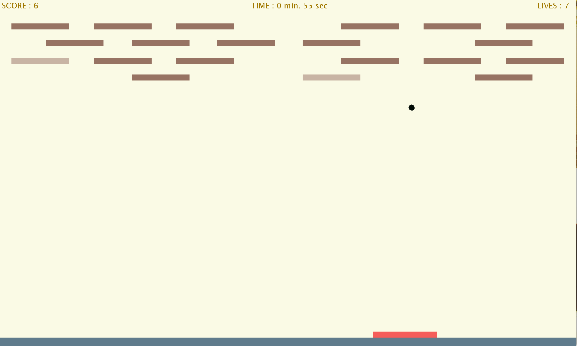 Bounce the little ball with the bar to destroy all the bricks. Try to survive all the levels to get a nice score or go as fast as you can to make the best chronos and be in the high-scores. Good luck !