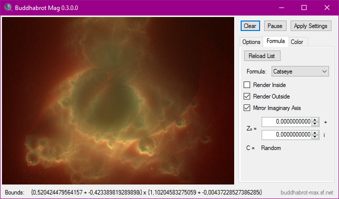 Consists of two separate programs, one focused on high resolution and high quality rendering ("Buddhabrot Max"), the other focused on realtime exploration / zooming ("Buddhabrot Mag").