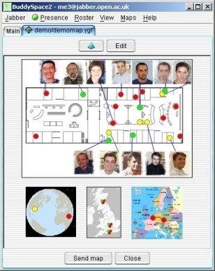 BuddySpace is an enhanced Jabber client providing secure presence management, web services and instant messaging. It extends the 'buddy list' concept with enhanced and customisable visualisation of presence (incl. maps, logical layouts).