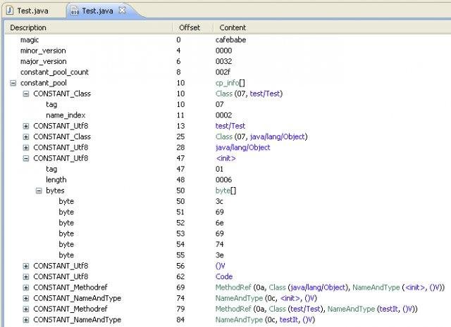 Visualize the byte code of Java in an eclipse view. You can see the byte code of your java sources in a structured way or can open an existing class file. All references are resolved, every byte is described.
