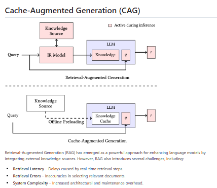 CAG, or Cache-Augmented Generation, is an experimental framework that explores an alternative architecture for integrating external knowledge into large language model responses. Traditional retrieval-augmented generation systems rely on real-time retrieval of documents from databases or vector stores during inference. CAG proposes a different approach by preloading relevant knowledge into the model’s context window and precomputing the model’s key-value cache before queries are processed. This strategy allows the model to generate responses using the cached context directly, eliminating the need for repeated retrieval operations during runtime. As a result, the approach can significantly reduce latency and simplify system architecture compared with traditional RAG pipelines. The framework is particularly effective when the knowledge base is limited enough to fit within the extended context window of modern language models.