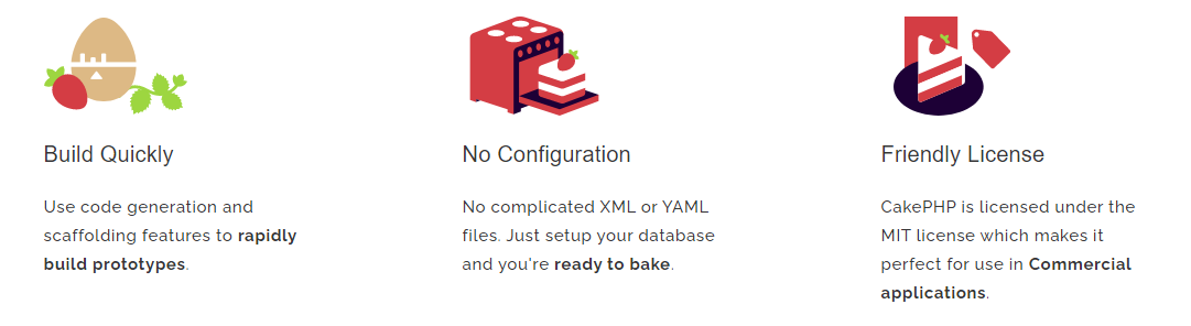 CakePHP 4.0.0 is as tasty as other major CakePHP releases but will now require you to use PHP 7.2. With a refreshed application skeleton design, CakePHP 4.0.0 comes with a streamlined API making your development and application faster. While 4.0 contains a number of breaking changes we have prepared an exhaustive migration guide covering all the deprecated and removed features as well as highlighting the shiny new features. CakeDC, the commercial entity behind the CakePHP framework, was established by Larry Masters, the founder of CakePHP. CakeDC offers CakePHP development, consultancy, CakePHP training and code review Services. From startups and social networks, to e-commerce and enterprise level applications, CakeDC provides the highest quality CakePHP development available. Use code generation and scaffolding features to rapidly build prototypes. No complicated XML or YAML files. Just setup your database and you're ready to bake.