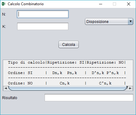 Un piccolo tool in java per effettuare calcoli combinatori come: