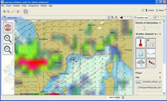 CapCode is a navigation software for sailors for cruising or regatta. - Reads NMEA 183 data (instruments, GPS, AIS). Implements computation of the VMG , tracing on RNC and ENC (S-57) charts. Display the polar on the chart, future position of the ship. Weather information acquired from grib files are also displayed in the navigation view.