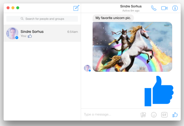 Caprine is an unofficial and privacy-focused Facebook Messenger app with many useful features. Caprine is feature complete. However, we welcome contributions for improvements and bug fixes. Dark theme, Vibrant theme, privacy-focused, keyboard shortcuts, menu bar mode, work chat support, code blocks, touch bar support, and custom styles. macOS 10.10+, Linux, and Windows 7+ are supported (64-bit only). For taskbar notification badges to work on Windows 10, you'll need to enable them in Taskbar Settings. Convert your messenger to a dark theme. Ability to toggle last seen/typing indicators. Interface adapts to smaller sizes. In-house notifications to keep you up to date. Caprine is a third-party app and is not affiliated with Facebook. You can toggle dark mode in the View menu or with Command d / Control d.