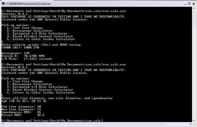 Console based application which should compile on any system supporting c++. Includes calculations like blood alcohol content, 1/4 mile run, liter conversion, etc.