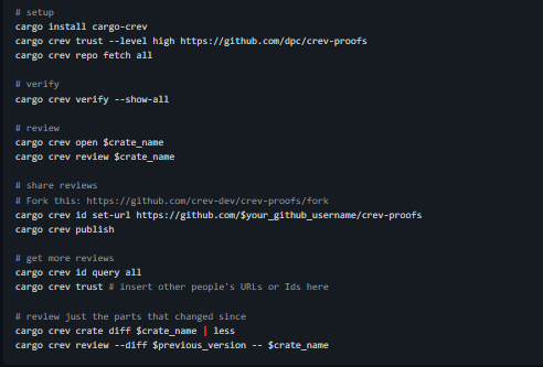A cryptographically verifiable code review system for the cargo (Rust) package manager. cargo-crev is an implementation of Crev as a command-line tool integrated with cargo. This tool helps Rust users evaluate the quality and trustworthiness of their package dependencies. Crev is a language and ecosystem agnostic, distributed code review system. Use reviews produced by other users. Increase the trustworthiness of your own code. Build a web of trust of other reputable users to help verify the code you use. Static binaries are available from the releases page. Crev is a system for verifying the security and reliability of dependencies based on collaborative code reviews. Crev users review the source code of packages/libraries/crates and share their findings with others. Crev then uses Web of Trust to select trusted reviews and judge the reputation of projects' dependencies.