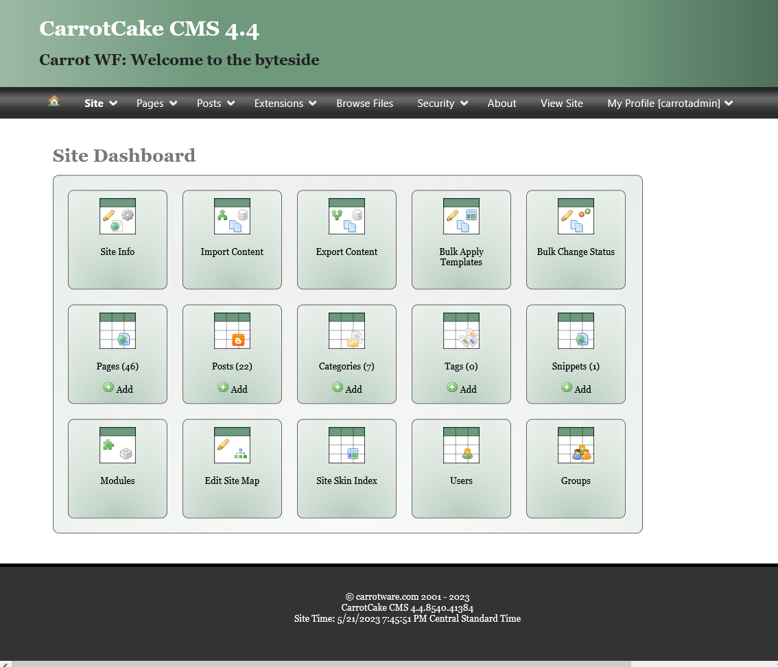 Some features include: blogging engine, configurable date based blog post URLs, blog post content association with categories and tags, assignment/customization of category and tag URL patterns, simple content feedback collection and review, blog post pagination/indexes (with templating support), import and export of site content, and import of content from WordPress XML export files.