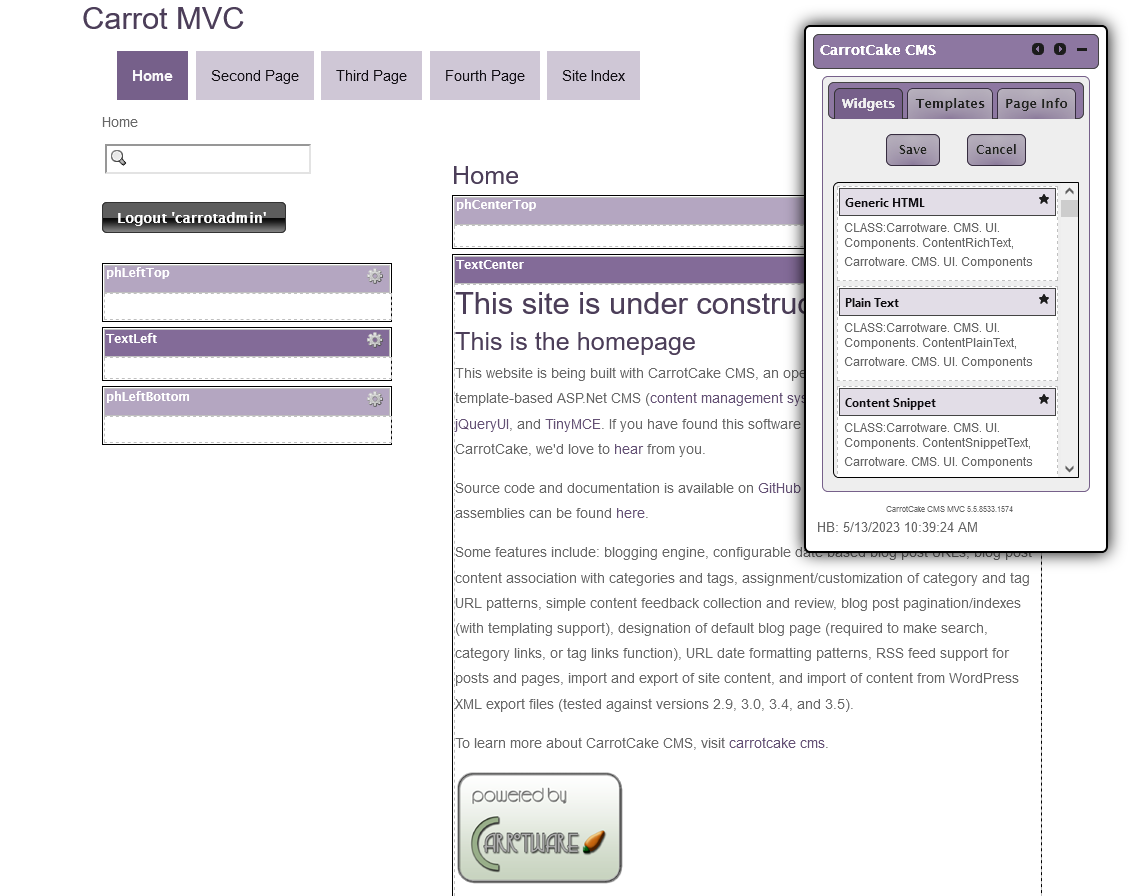CarrotCake CMS MVC 5 is a template-based ASP.Net 4.5 MVC5 CMS (content management system) built with C#, SQL server, and JQuery, providing an intuitive WYSIWYG/drag and drop edit experience This content management system supports multi-tenant webroots with shared databases.