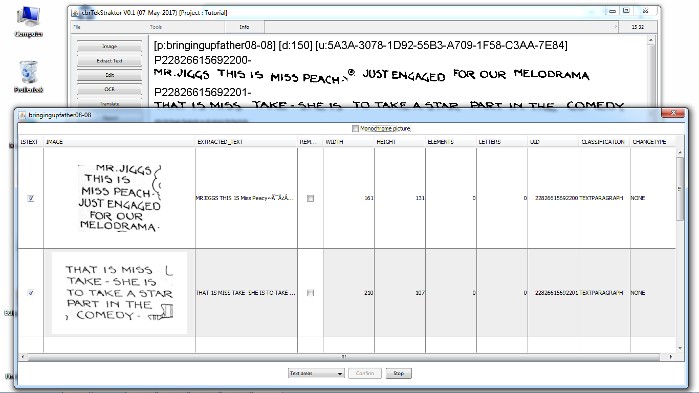 cbrTekStraktor is an application to automatically extract text from the text bubbles or speech balloons present in comic book reader files (CBR). Its prime goal is to perform analysis on the texts of comic books. cbrTekStraktor can however also be used for scanlation or similar purposes.