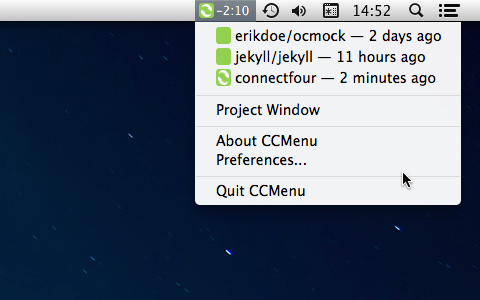 Displays the status of continuous integration servers in the Mac OS X menu bar. Works with all servers that support "cctray" feeds, which includes ThoughtWorks Go, Jenkins, Travis, and others.