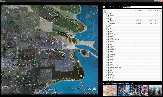 C# rich client, displaying the data of a free towns database in a Google Earth component, a Tree Table visualization component and showing Bing image results of these data.