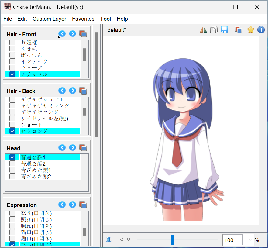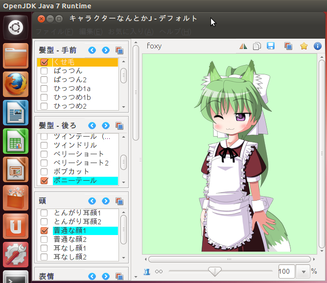 このアプリケーションは、K.Hみっくす ふぁーすとえでぃしょん さんの 「キャラクターなんとか機」を目標にJAVAによりフルスクラッチから書き起こしたものです。 初期状態で、「キャラクターなんとか機」と同じカテゴリ、レイヤー順序、ディレクトリ、カラーグループの設定がされたプロファイルが作成されますので、 「キャラクターなんとか機」のパーツデータをインポートして使うことができます。