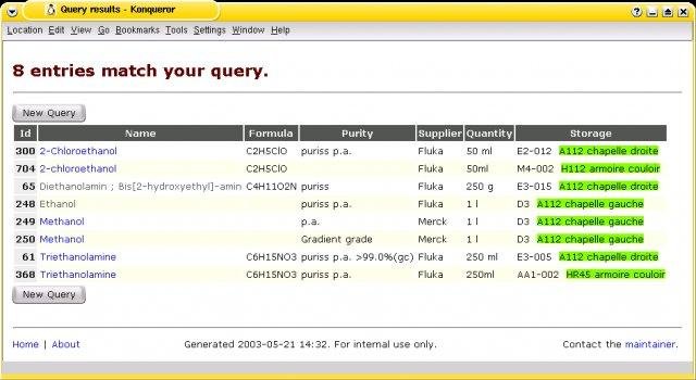 The Chemicals Database is a simple yet effective approach to track a stock of products. It provides a "product catalogue" that is accessible from any workplace over Intranet (http) and the server can be operated "in the cloud".