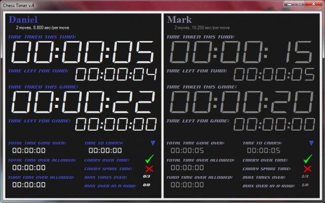 Chess Timer is a chess clock program, used to time and set limits (with increment) on conventional chess games. See features for details. Download the new, rough around the edges, v4, or stick with the reliable, but ugly (refer to screenshots), v3.3.
