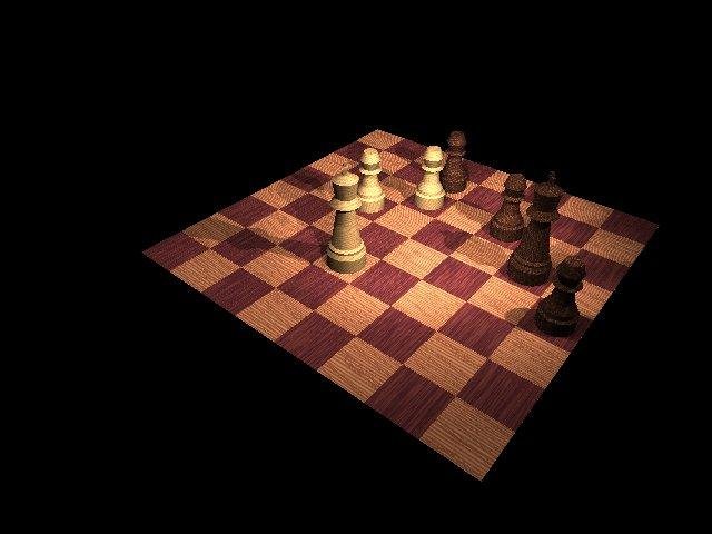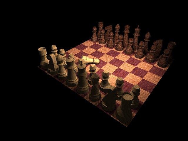 A Perl script which accepts a chess position (in the FEN format) as input and outputs POV-Ray source, which, when rendered by POV-Ray, produces a 3-D view of the chess position.