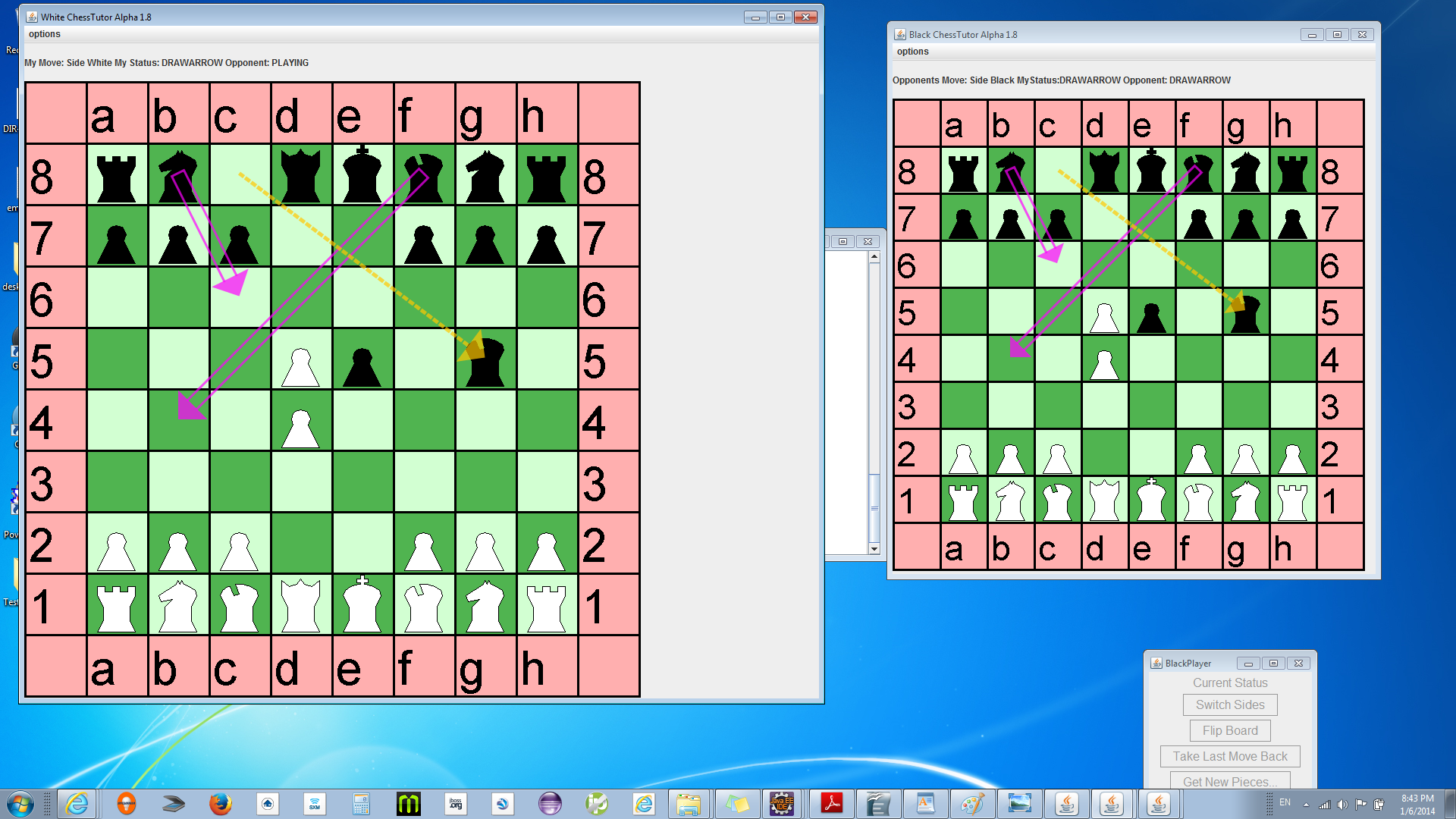 Program written in Java to teach beginners chess over the Internet. Allows complete movement of pieces and setup of board. Board is completely resizable. Tutor will run the client and server on his own machine and student will run client on his computer. It has three modes. Play mode, Move Pieces Mode and New pieces modes.