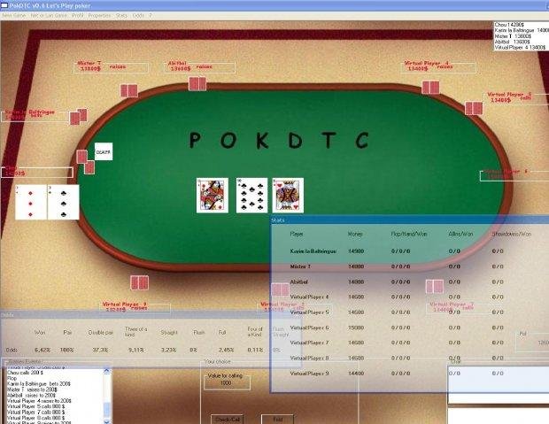 "PokDTC" is a free Poker Texas Hold'em Pot/No/Limit Multiplayers simulation written in C#. You can play over the net against friends or virtual players. Chat included. High score online at http:/chouprod.sourceforge.net . Voices. Speaker.