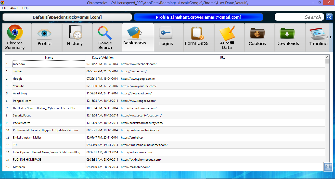 The Chromensics tool is developed to read all information from chrome browser directory and present it to user, in easy readable tabular format which can be explored in descent interface without running the chrome browser. The tool will also allow you retrieve information from other chrome installation brought from different machine for analyzing. The acquired artifacts can be exported in PDF report to present it in court of law or to superiors.