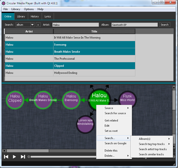 Search using last.fm:similar tracks, artist top tracks, tag top tracks, album tracks