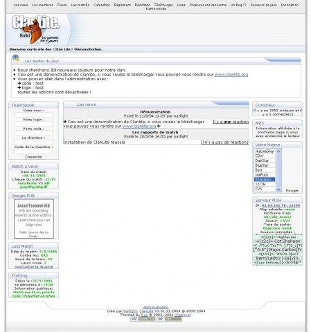 ClanLite est un portail php/mySQL pour tout type de communauté de jeu on-line. Il est entiérement personnalisable tant au niveau graphique quant à son contenu. D'une facilité d'emploi enfantine, avec son panneau d'administration simple et clair.