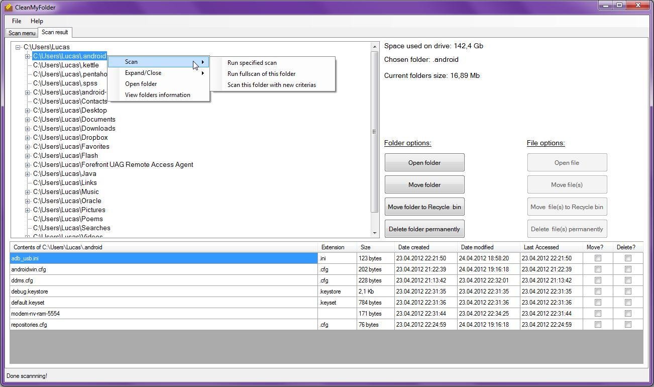 CleanMyFolder scans your selected location and lists up the folders and files related to your scan. Then you have the option to move or delete the selected folder and files.