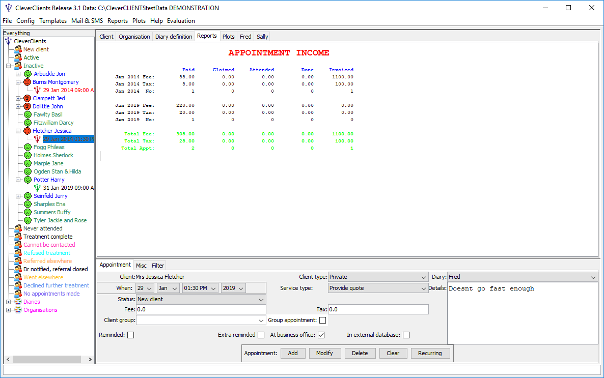 The software is configurable to suit your businesses (e.g. for the services provided and the fees charged). Several example businesses are provided that you can investigate to see how CleverClients can meet your needs.