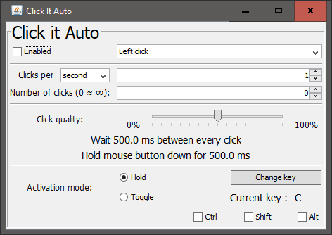 Click It Auto is a fast auto clicker. You can choose the mouse button, the hotkey, the click quality and the amount of clicks that shall be done.
