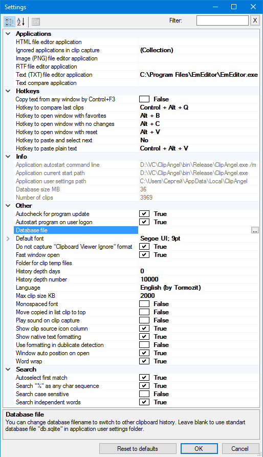 - Setting "Database file" to switch clip lists