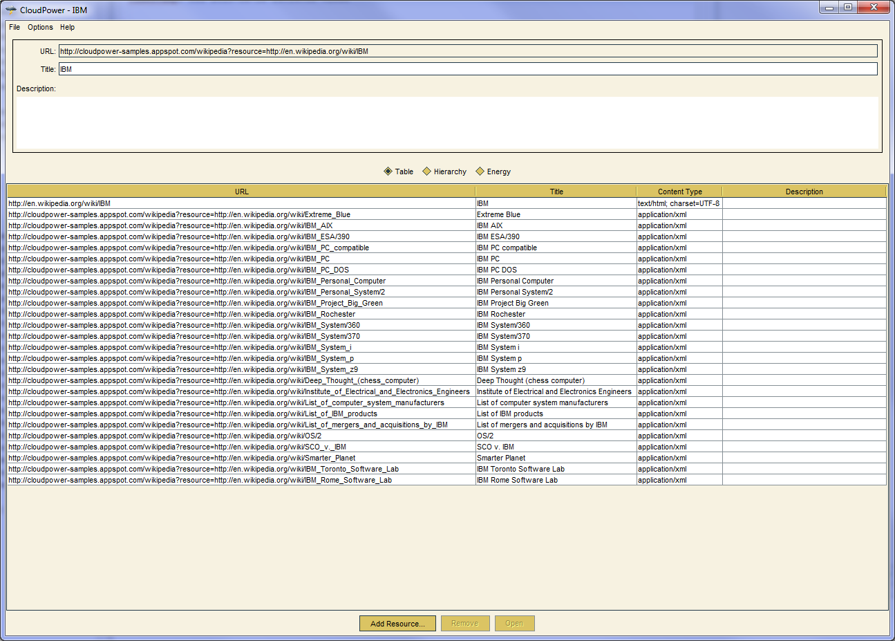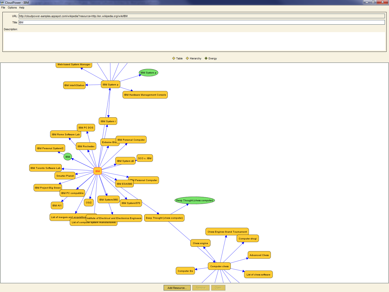 CloudPower is a Java application that offers functionality similar to that found in operating systems, for the World Wide Web. References to Web resources, whether they be static or dynamic can be arranged into sets. These sets can themselves contain other sets, allowing for resources to be arranged like files on an operating system. These sets can be saved and retrieved, allowing users to organise their cloud resources. Two graph visualisations (hierarchy and energy) let users quickly navigate the structure of references between resource sets. The energy visualisation is particularly good at showing this structure in a compact manner when the links represent information arranged as an arbitrarily directed graph rather than a tree. CloudPower also demonstrates how remote desktop applications can be displayed locally using X Windows, for any operating system and network configuration.